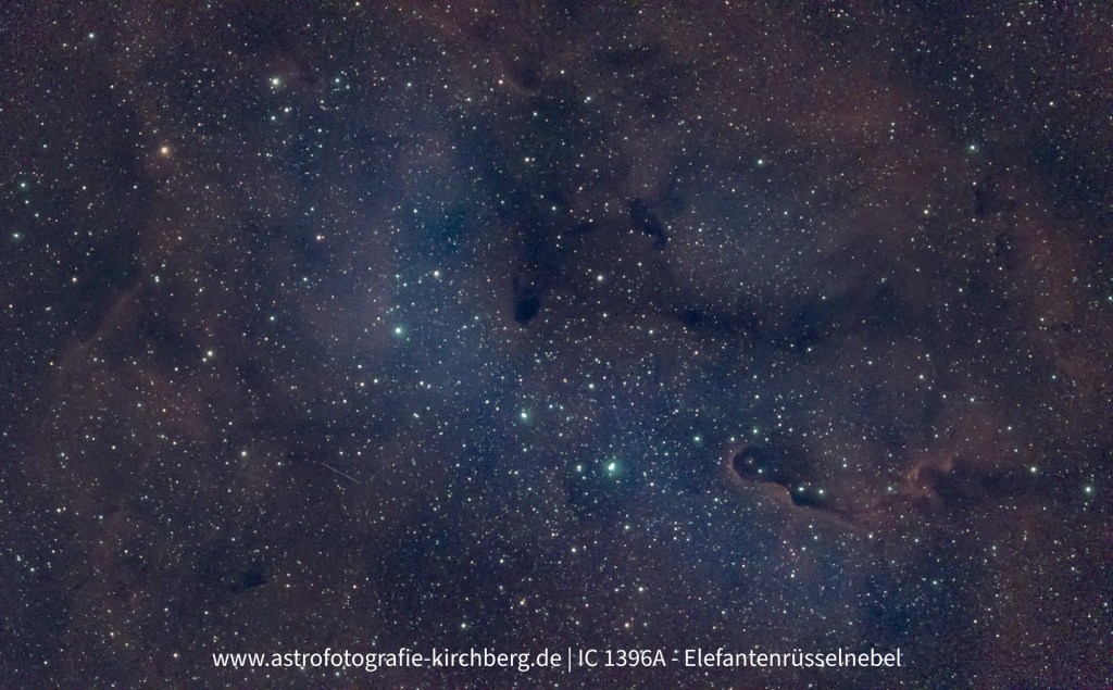 Der Elefantenrüsselnebel – IC 1396A – zählt zu den eindrucksvolleren Objekten im Sternbild Kepheus. Diese dunkle, säulenartige Formation aus Gas und Staub befindet sich etwa 2.400 Lichtjahre entfernt und ist ein aktives Sternentstehungsgebiet innerhalb des großflächigen Emissionsnebels IC 1396. Seinen Namen verdankt er der charakteristischen Form, die an einen gebogenen Rüssel erinnert.
