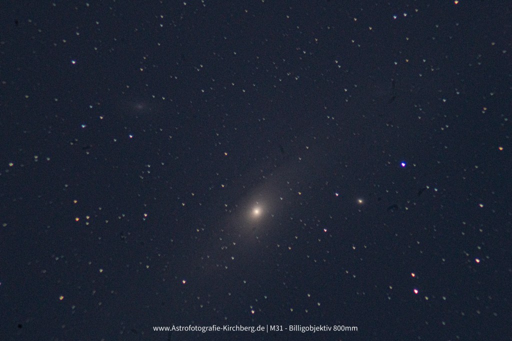 Zum Schluss habe ich sogar noch ganz kurz die Andromeda-Galaxie erwischt. Das Ergebnis ist zwar nicht perfekt – mein Objektiv war doch ziemlich verschmutzt – aber man sieht, dass durchaus etwas herauszuholen ist. Auf jeden Fall steckt da noch viel Potential drin.