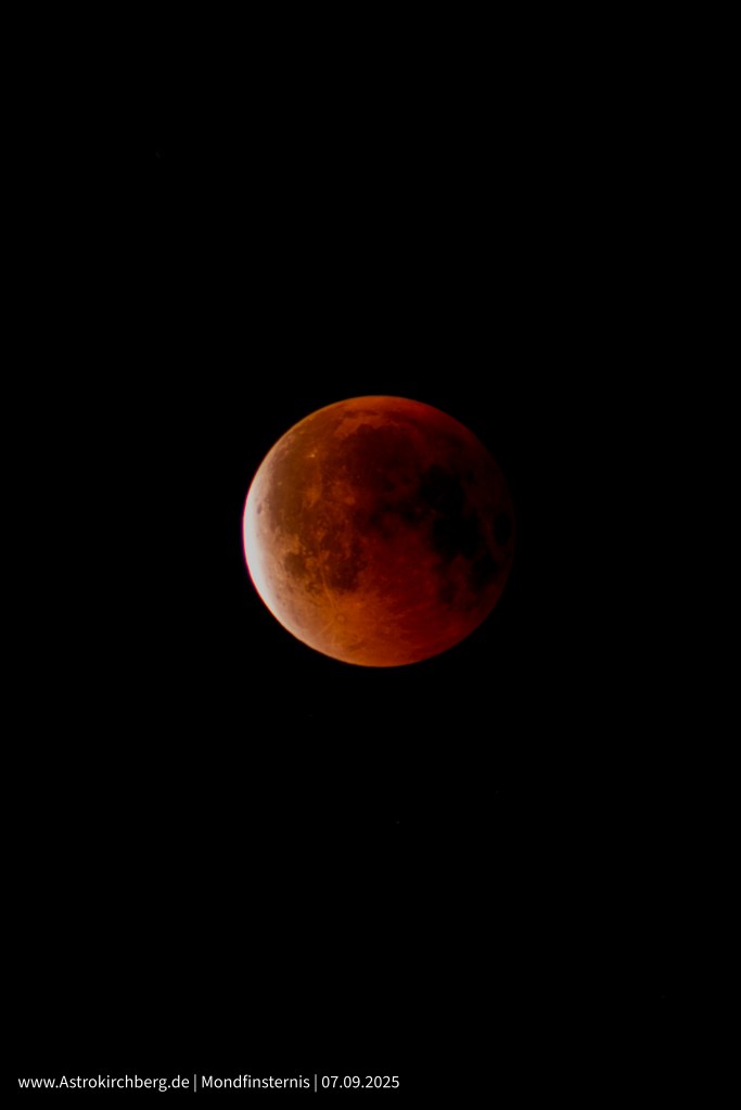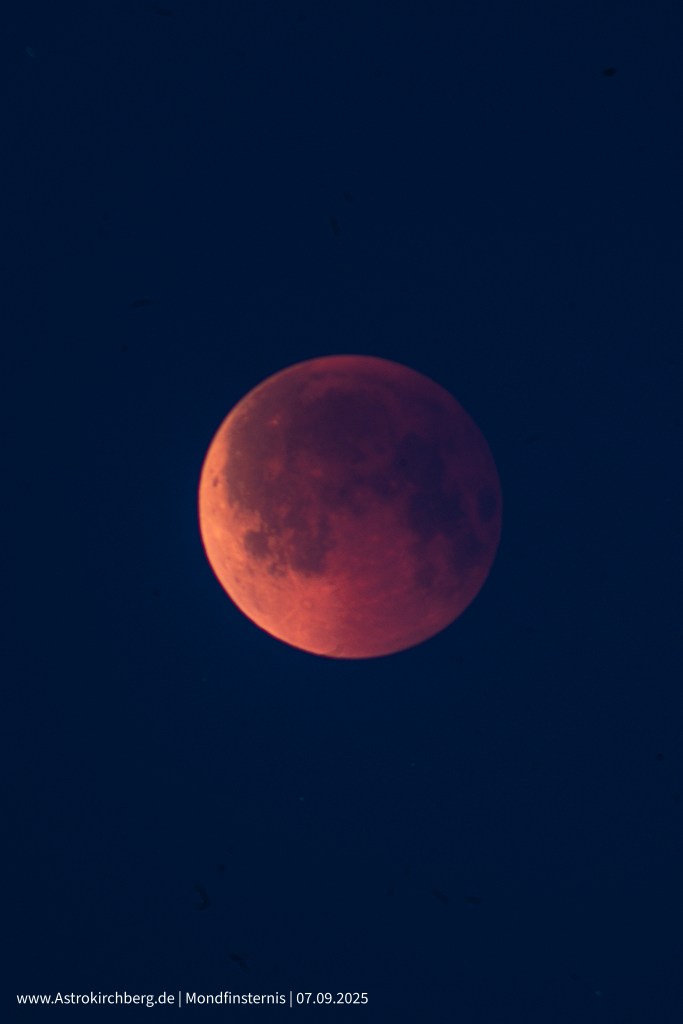 Während der Totalität erscheint der Mond in einem tiefen, rötlichen Licht. Grund dafür ist die Erdatmosphäre: Das Sonnenlicht wird am Rand der Erde gebrochen, gestreut und vor allem in den roten Wellenlängen weitergeleitet. Im Prinzip ist es das gleiche Phänomen, das auch für rote Sonnenuntergänge sorgt – nur dass hier das Licht um die gesamte Erde herum gebogen und auf den Mond gelenkt wird. So entsteht der berühmte „Blutmond“.